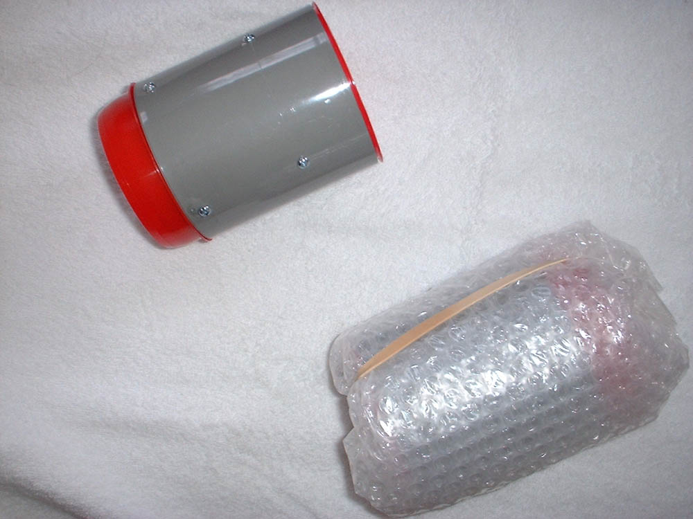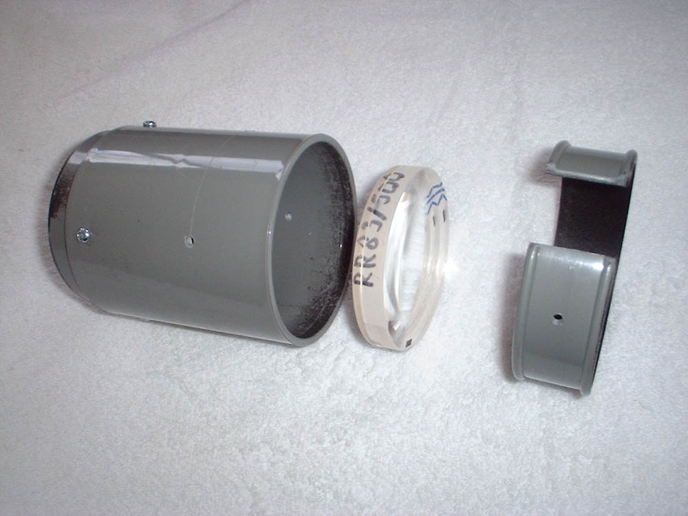 I think the cell design is pretty clever. There are three spacers glued in place that hold the lens in the center of the coupling. A reducer bushing is inserted from the front and held in place with three screws. This restrains the front of the lens and provides a nice little adapter to slide on another coupling to make a dew shield. A piece of PVC pipe material is split and adjusted to be a force fit into the rear of the cell. This is pressed into place after the doublet is inserted and held in place with three screws. Everything inside is painted flat black. Simple Eh!