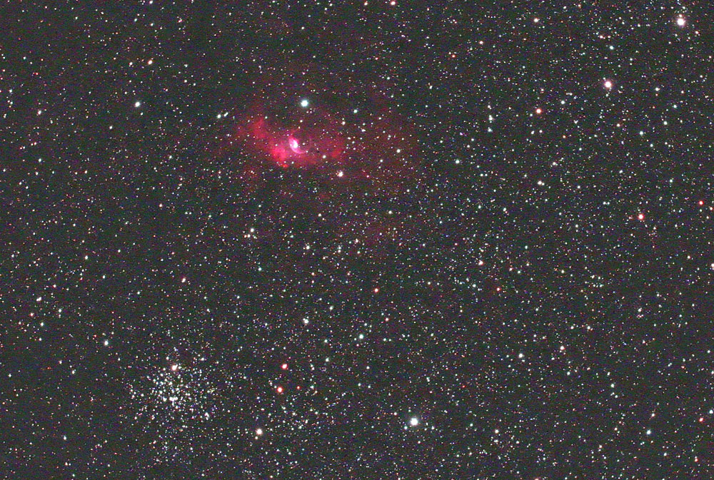 Comments: I wanted to see the results using ISO 1600. The image is pretty noisy but I did capture a lot of signal in each sub-frame. My processing skills are not good enough to rid myself of all the noise yet. Note the open cluster M52 below the nebula.
