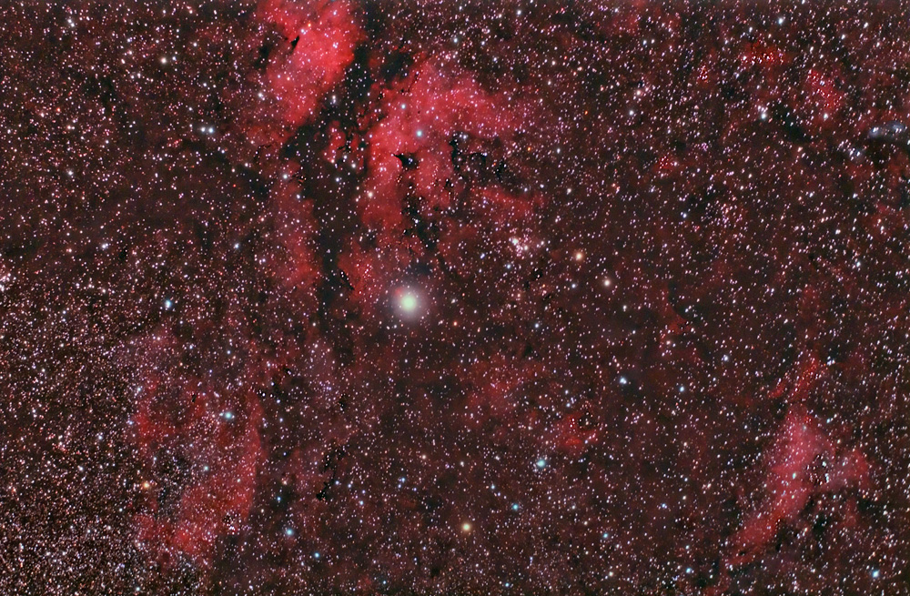 Comments: I am pretty pleased with this shot. The two hours of 10 minute exposures shows the extensive areas of dim h-alpha emitting gas in the background shot through with areas of cold dark gas. This is just what I was trying to see in this shot. The bright red areas are parts of IC1318, the small open cluster right of center is NGC6910 and the blue reflection nebula on the right edge near the top is NGC6914.