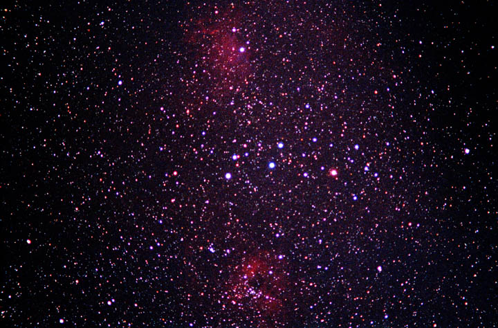 Comments: The target was the asterism STAR4, which are the bright stars in the middle of the shot. I was surprised that the red nebulosity and even a little blue up in the "Flaming Star" showed up in such a short exposure. I need to make some longer exposures but this new film may have more possibilities than I originally thought.
