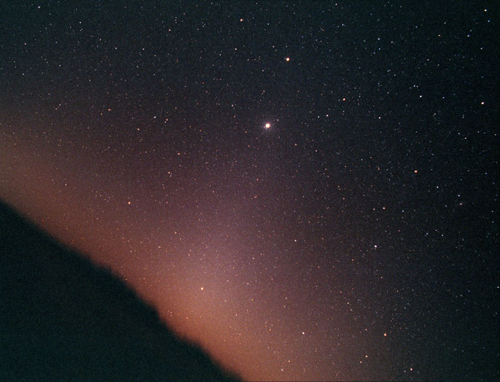 Comments: The horizon is tipped in the picture because the camera was mounted to a piggyback mount on my G11. You can see Mars near the horizon and Jupiter and Saturn higher in the sky. The zodiacial light is the wedge shaped misty light coming from the ground in the plane of the ecliptic. This is actually too wide a lens and it "compresses" the wedge too much. Last year's 24mm wide angle shot was nicer because of less "compression". I could see the zodiacial light every night that I went to the Empire Ranch site.