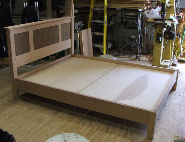 The next step would be the bed. Woodsmith obligingly published plans for a matching bed and I accordingly built it substituting QSRO and Walnut for cherry and dyed cherry.