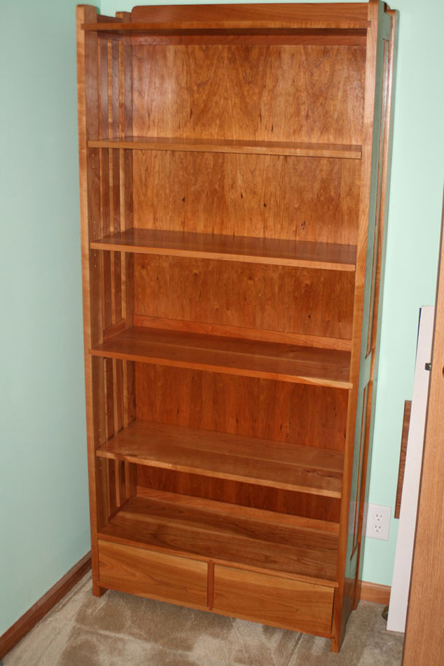 I finally finished this Cherry Bookcase. Plans were from Woodsmith Magazine modified to be taller and have an additional shelf. This case uses sliding dovetails pretty extensively to solve wood movement issues. The side slats are mortise and tenon construction. I had planned to wipe on Watco Natural, spray with shellac and then spray with a water based topcoat. I did fine until the topcoat and I found my small HVLP would not spray General Finished WB topcoat. I changed the topcoat to a wiped on General Finishes Gel Urethane and all was well.