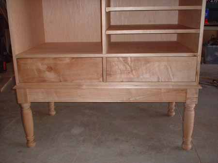 Construction would be a simple dadoed plywood case with thick banding on the plywood edges. The wood of choice would be maple as that is what the turned legs were made from.