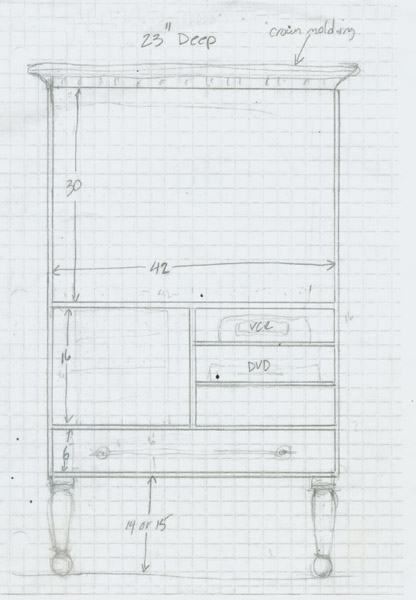 My sister asked if I could build her an entertainment center to hold her new TV and stereo equipment. I asked her what she wanted and she gave me this sketch: