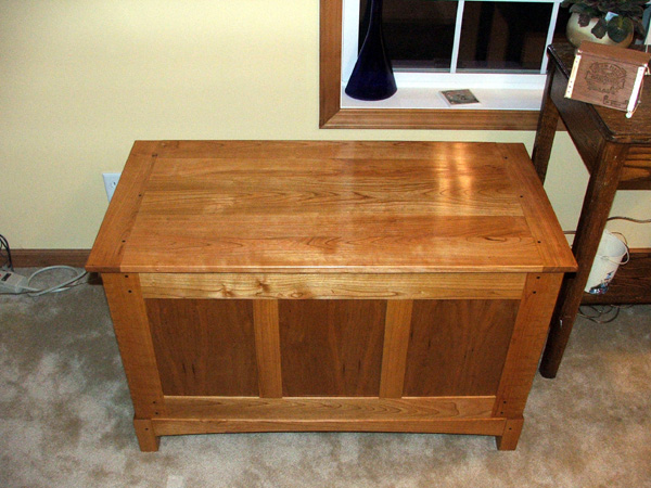 I finally settled on a blanket chest. I sketched out a design and started to make pieces for it. I decided to use box joints for the corners, frame and panel construction and breadboard ends on the top. I also lined the inside with aromatic cedar.