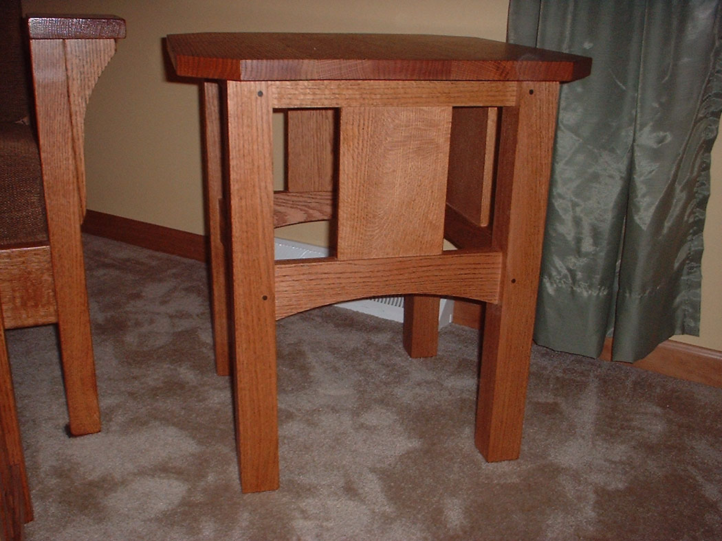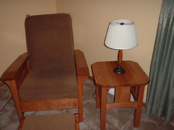 The first furniture piece that I made was this Stickley Side Table. I wanted something to go with the Morris Chair that we bought in Ann Arbor. Jan bought me the wood and a book with the plan as a gift and once we were settled in out here I took a deep breath and got started. It came out pretty good. If I had known I would have paid a lot more attention to grain selection but heck - it was my first time. It now has a place of honor in my livingroom and we use it every day.