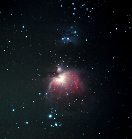 Most of you are familiar with Island Lake but let me try to describe the conditions. It was clear, but very humid. The sky was steady but not very transparent. I would rate the transparency at a "4" at most. All in all it was a very poor night for seeing. I could only see hints of the milky way structure, M31 was an averted vision object, and only bright stars were visible. Looking at the stars visible in ursa minor I estimate magnitude 4 stars were visible at best. I did not expect much from the photos due to the sky condition even though the dob that was out showed some very nice views. I was mainly looking for round stars indicating good tracking. When I processed the negatives I was surprised at how much detail was picked up. The shots of M42 were very usable and I digitally stacked them and came up with a nice astrophoto. Likewise the shots of M45 and the asterism in the head of Orion were also suprisingly good.
